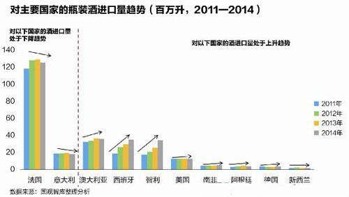 在国产葡萄酒呈现出触底反弹态势的同时,进口葡萄酒表现也令人满意。来自国观智库的数据显示,2014年瓶装酒进口量、额增速均有所下滑;散装 酒进口量下滑速度减缓,进口额及其增速持续下滑;起泡酒进口量、额增速大幅回升。其中,2014年瓶装酒进口量同比增长3.24%,均价下滑4.4%。作 为进口酒的重中之重,瓶装酒进口量已经占到了总进口量的75.1%。